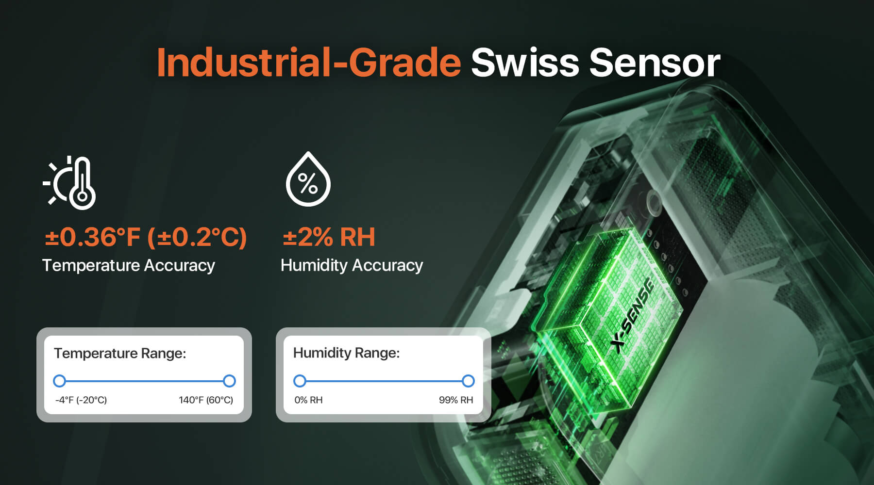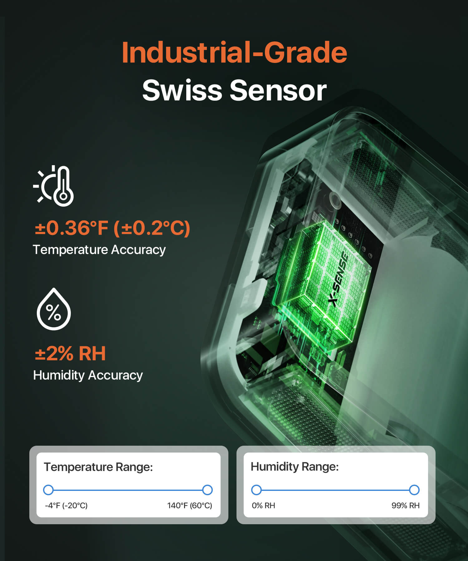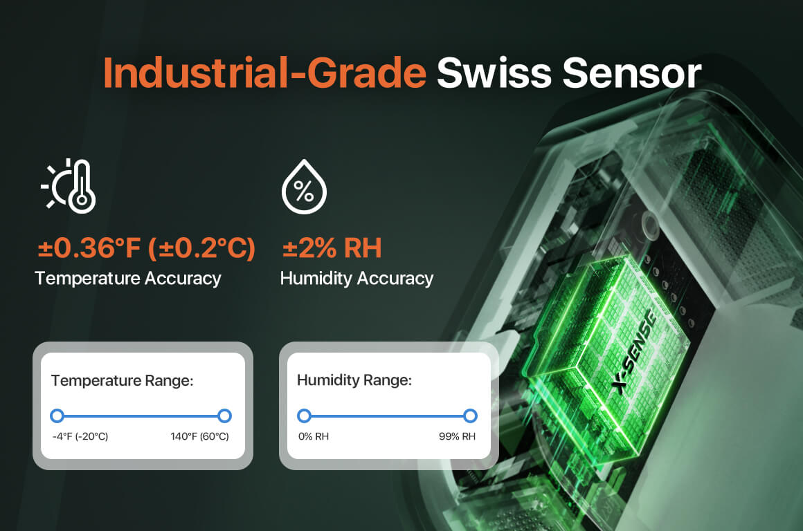 - Built with a Swiss-made sensor, the X-Sense STH0A delivers highly accurate readings: Temperature Range: -20°C to 60°C with ±0.2°C accuracy. Humidity Range: 0-99%RH with ±2%RH accuracy. This ensures precise tracking for sensitive environments like greenhouses, wine cellars, or baby rooms.