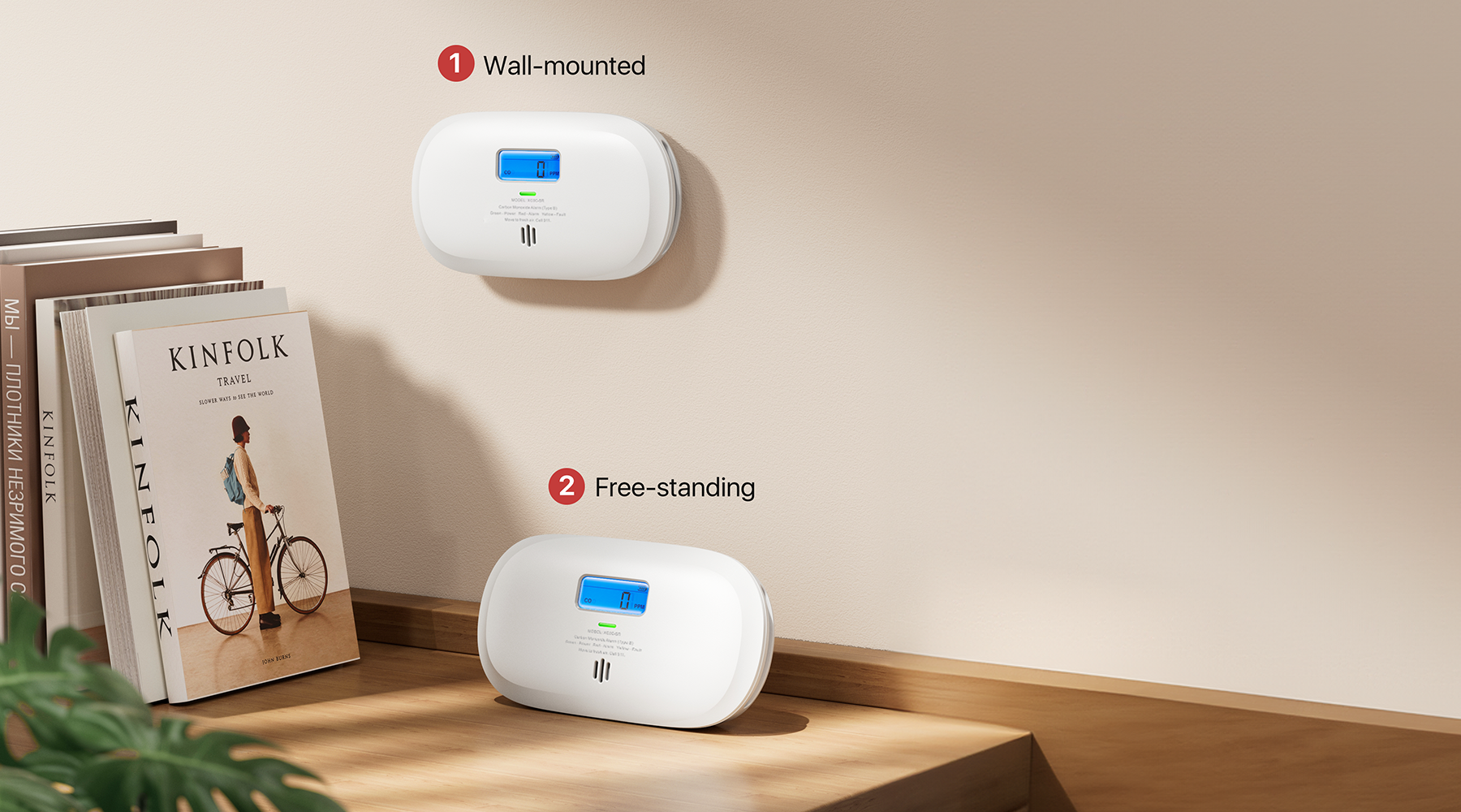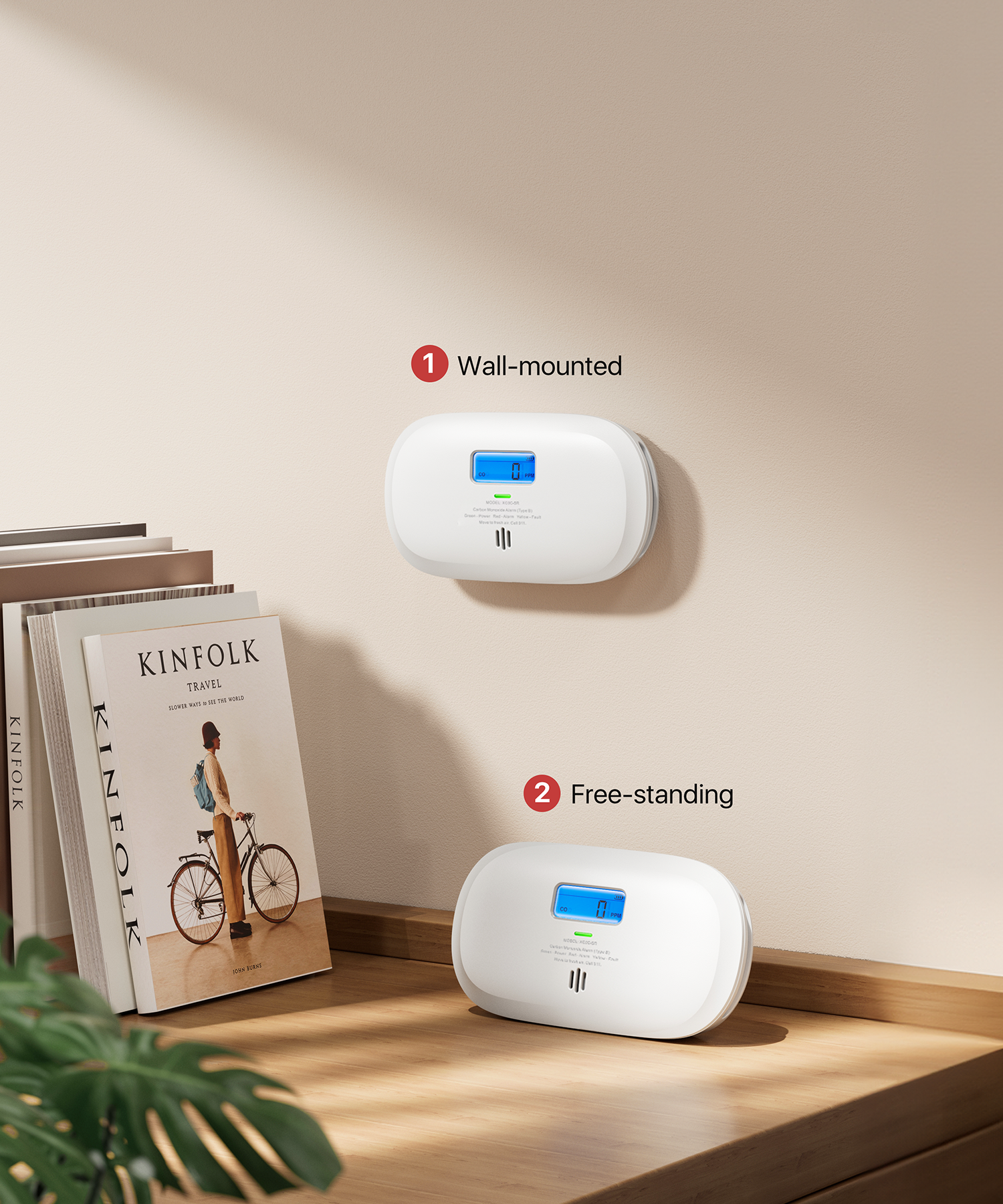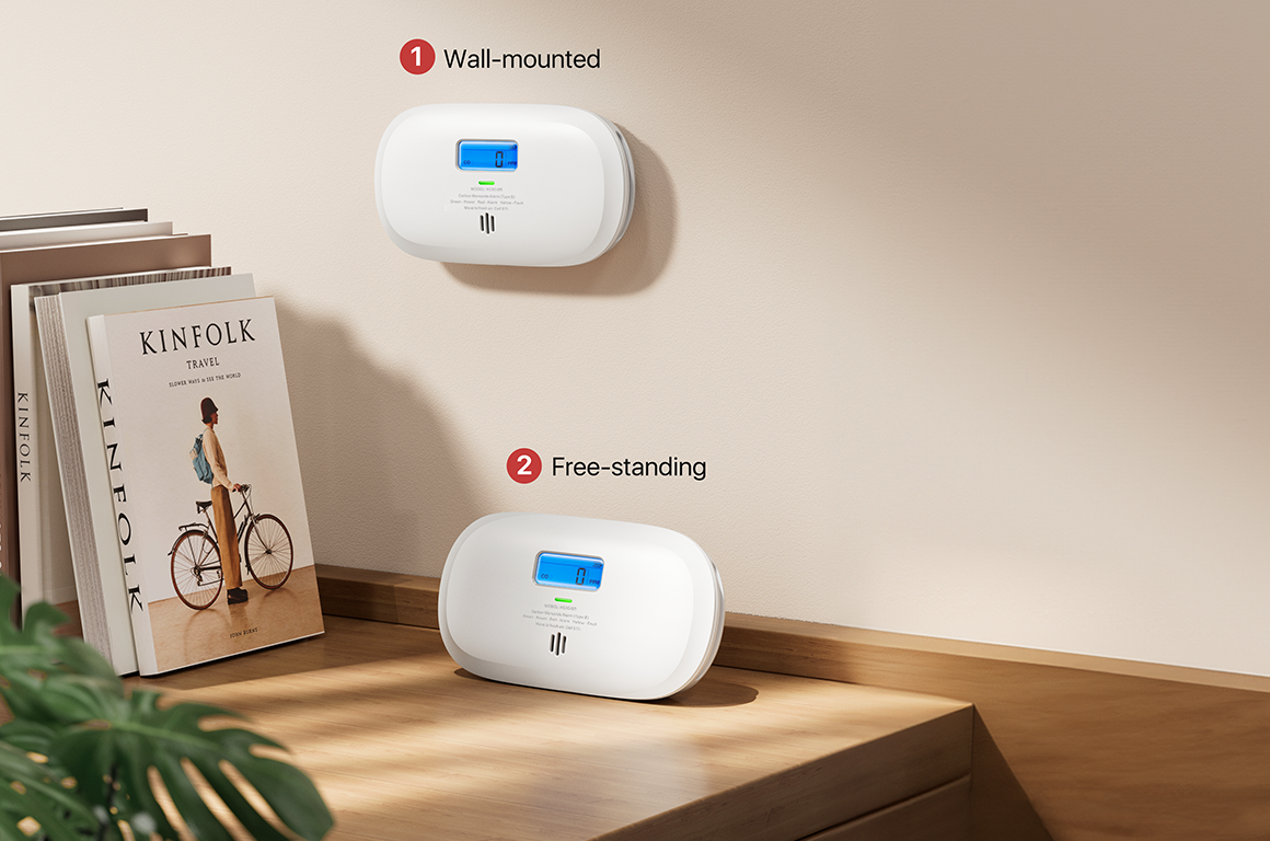 - This CO detector's flexible design allows you to place it on any flat surface, such as a desk, bookshelf, or bedside table; screws are also included to mount it on the wall.