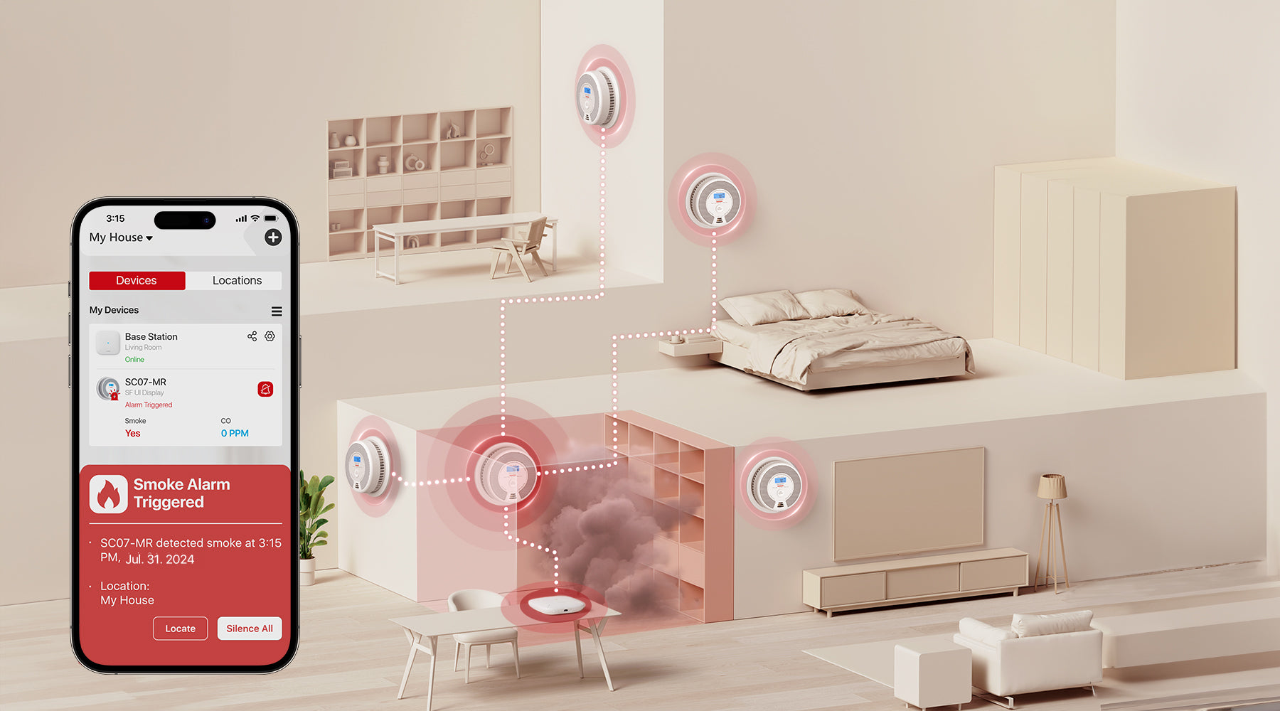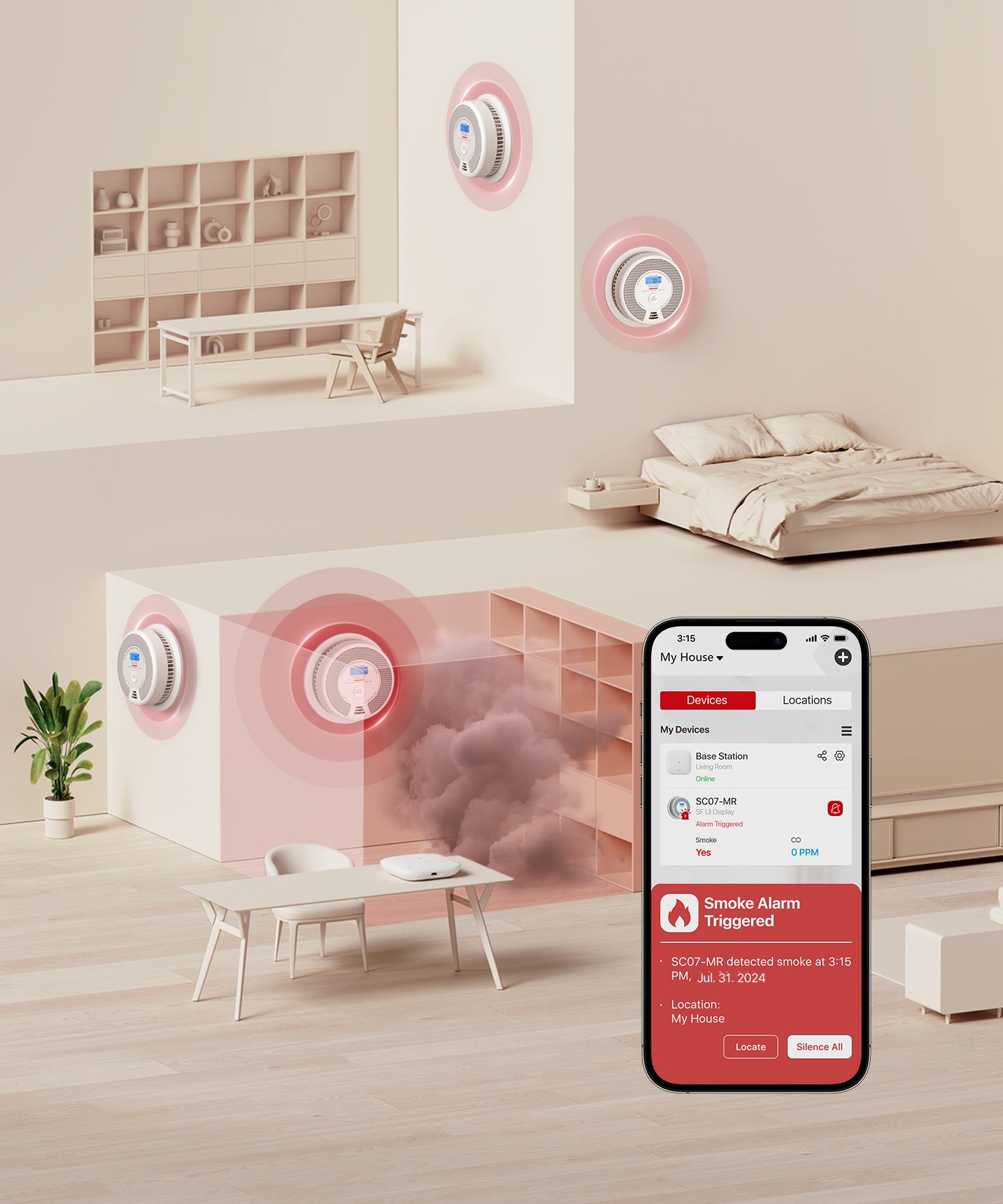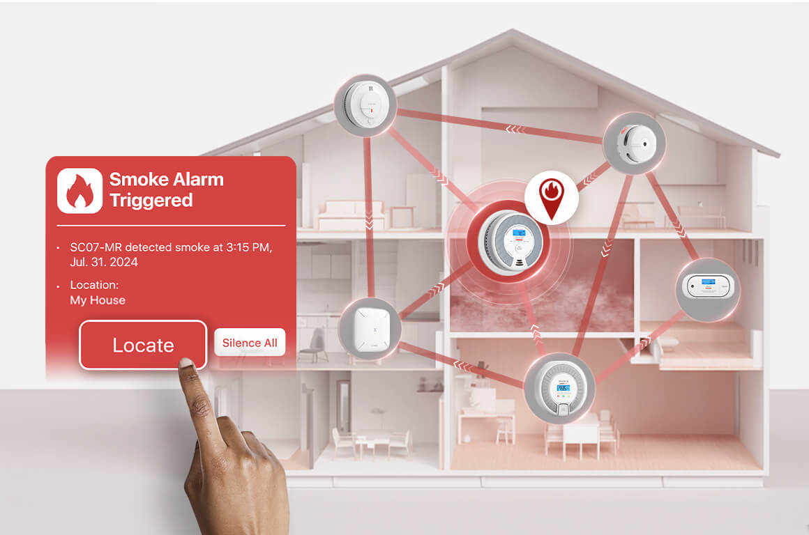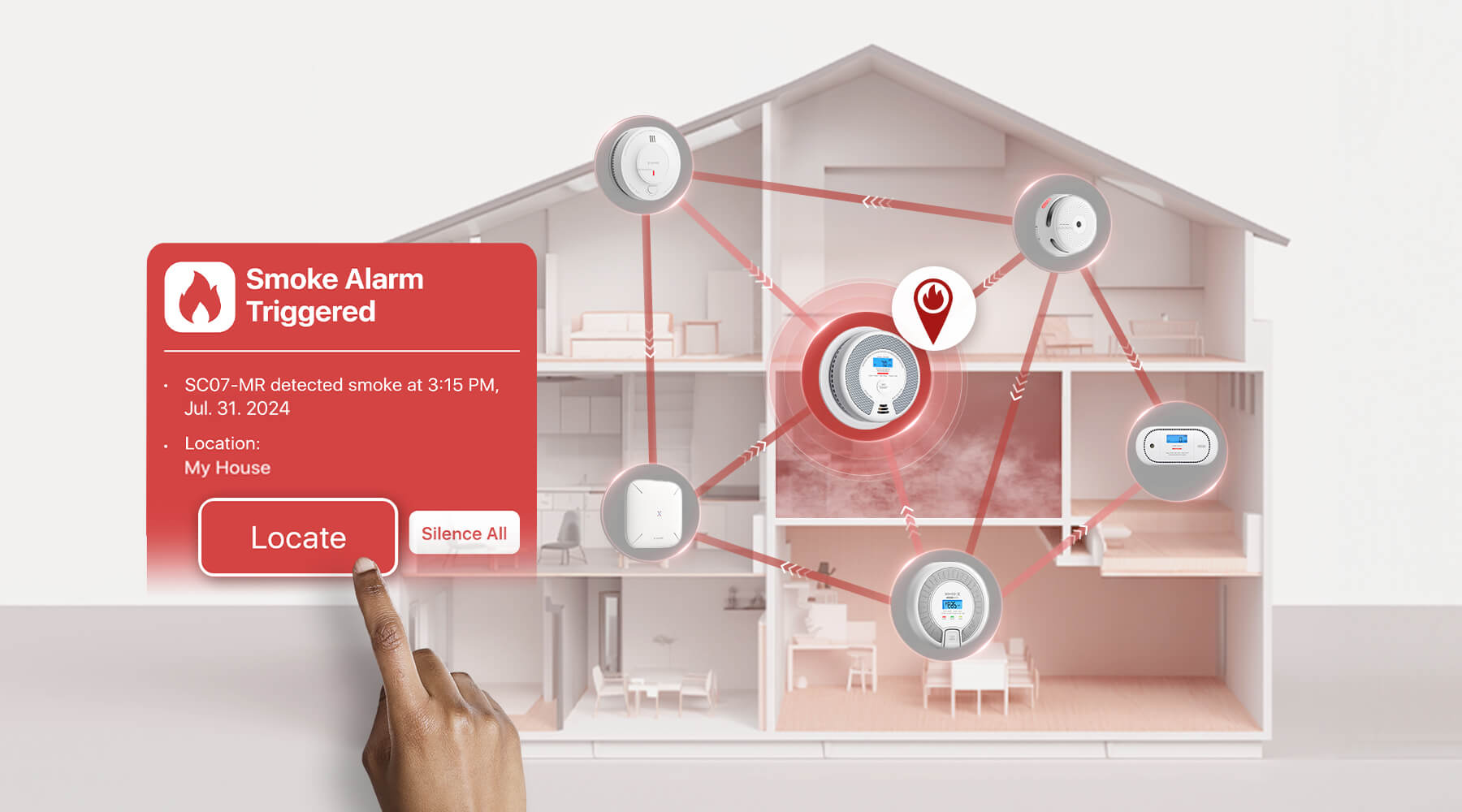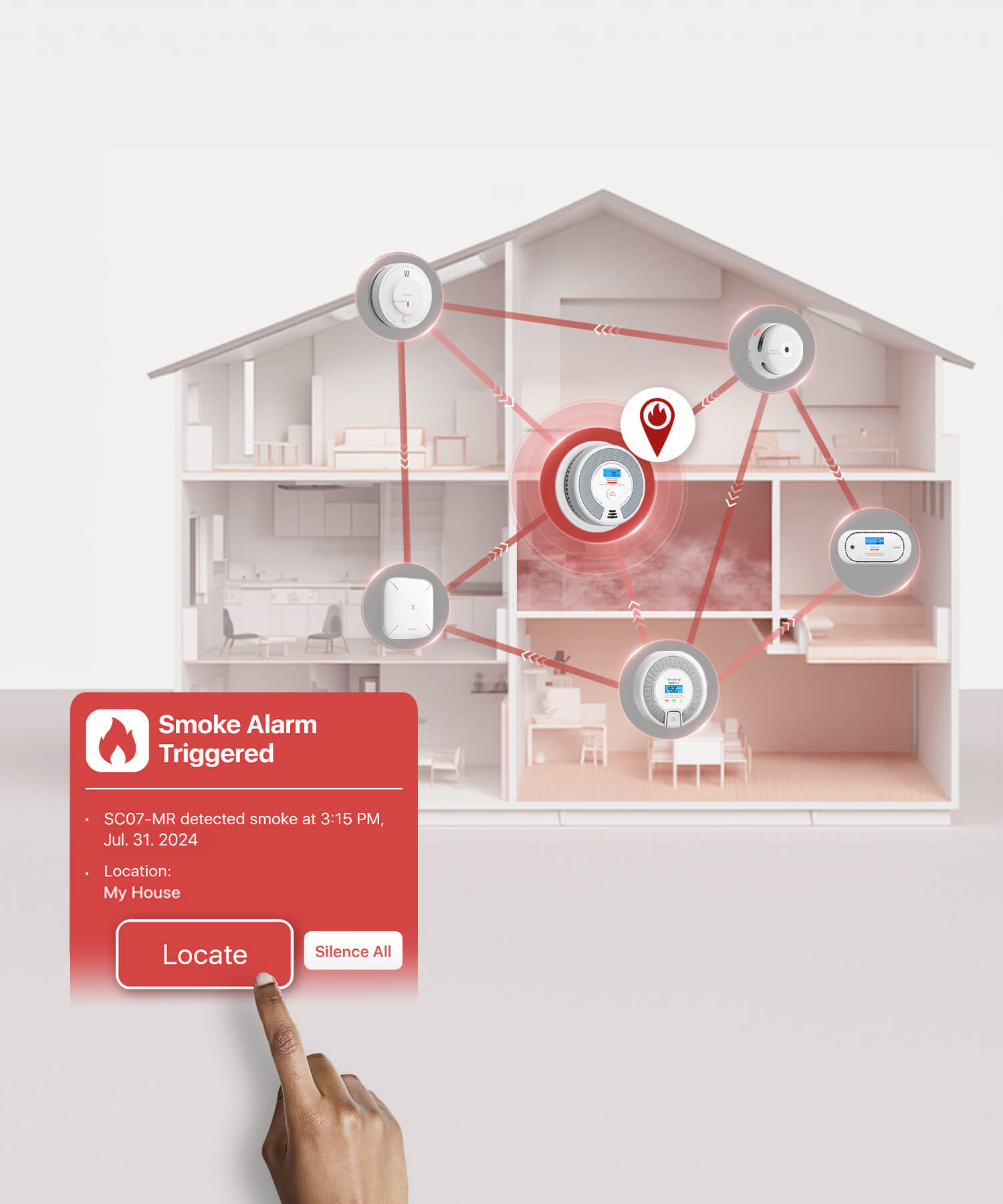 - All connected SC07-MR alarms sound simultaneously when one detects a threat, ensuring the alarm is heard throughout your home, and everyone can react quickly to potential dangers.