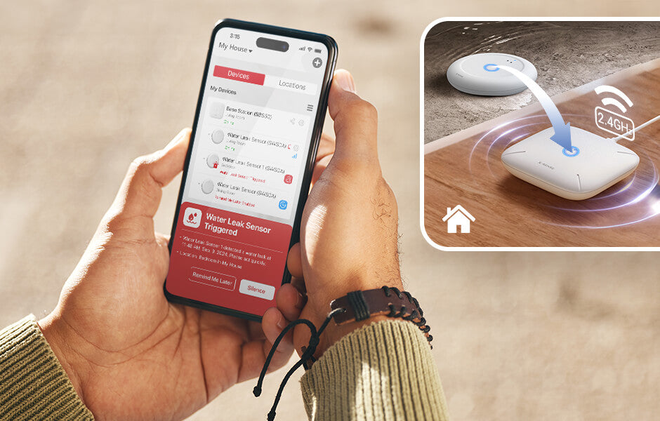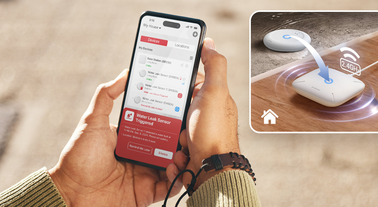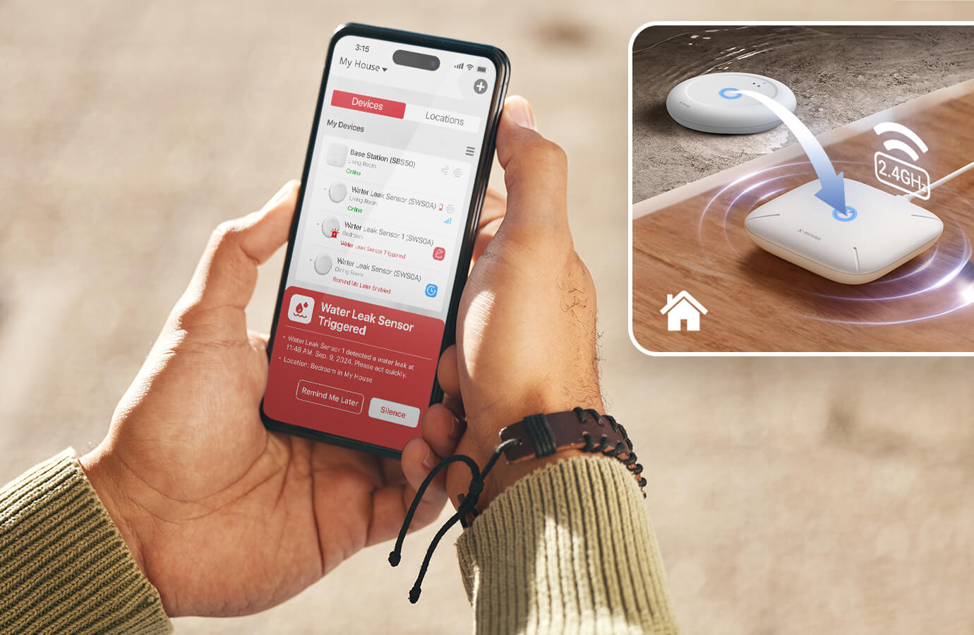 - When water is detected, the sensor triggers a loud 100 dB alarm from the base station and sends instant notifications to your phone via the app.
