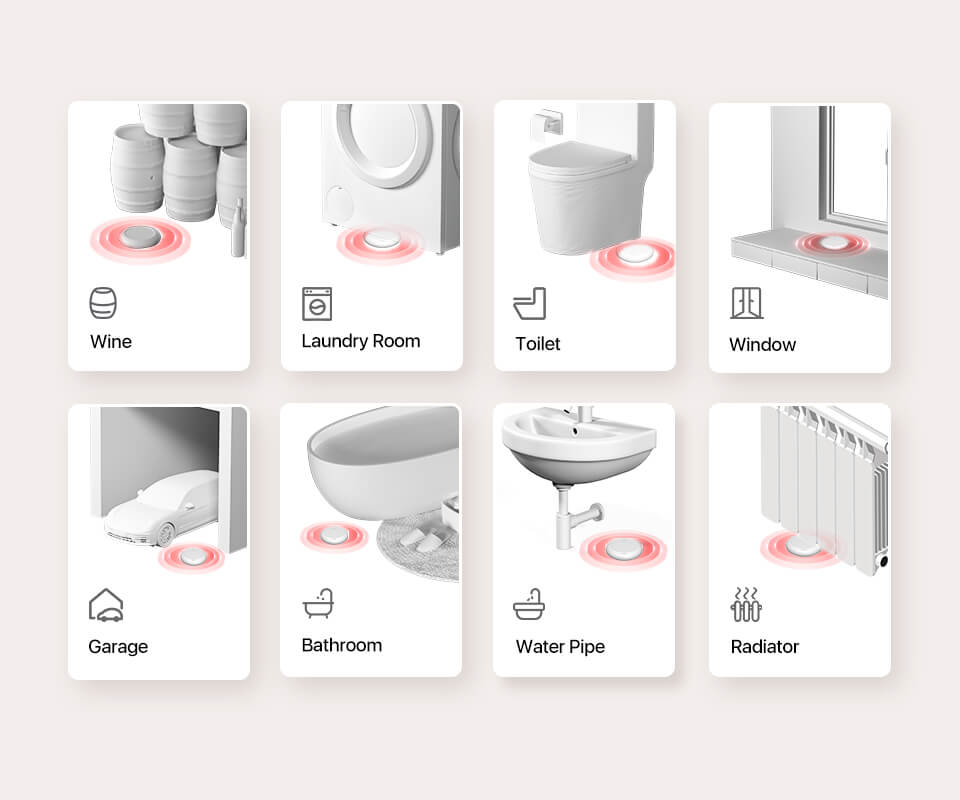 - When water is detected, the sensor triggers a loud 100 dB alarm from the base station and sends instant notifications to your phone via the app.