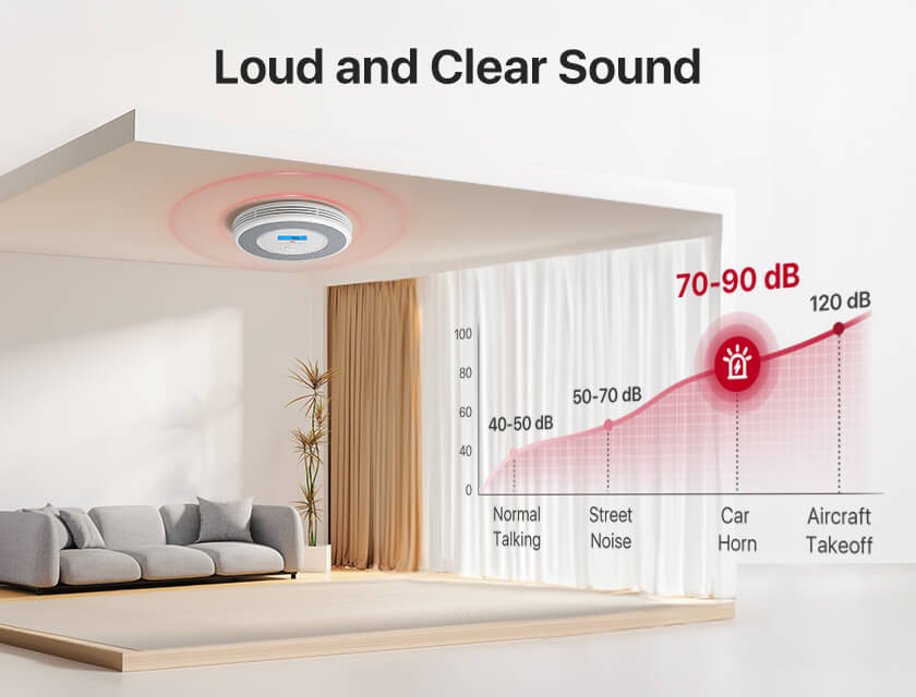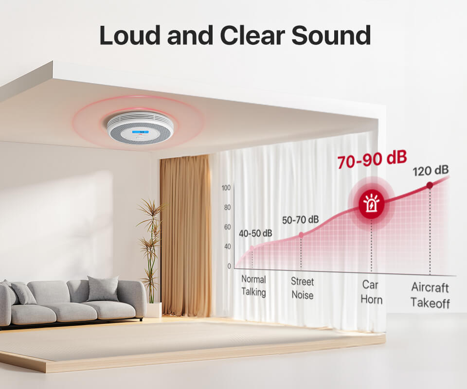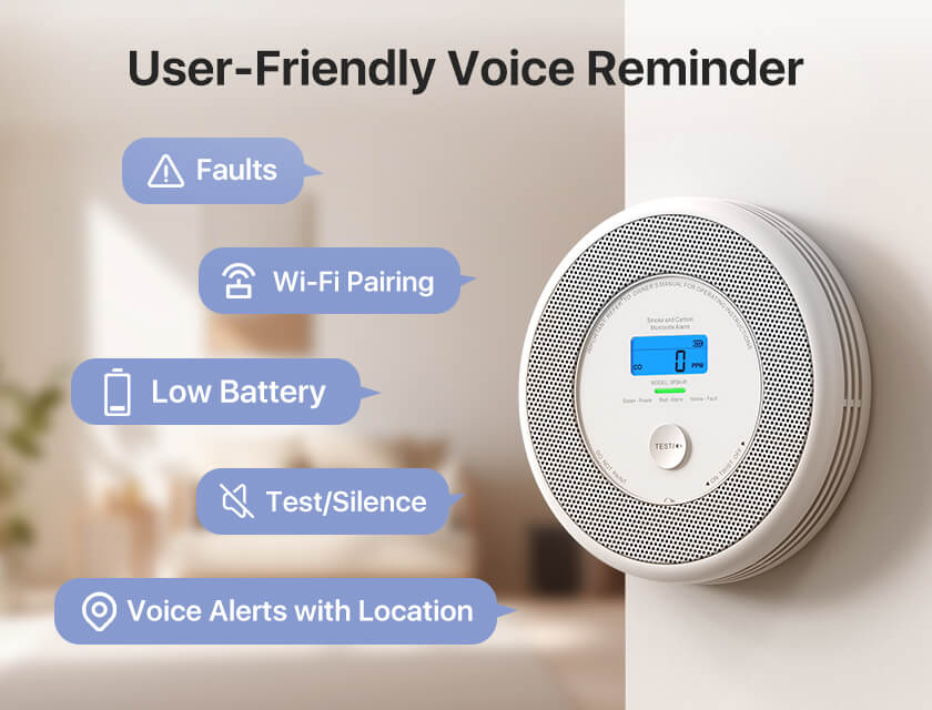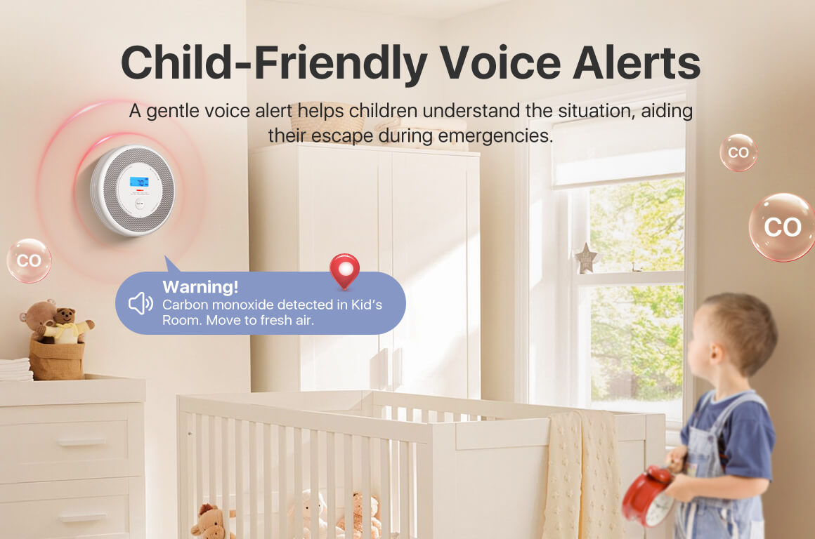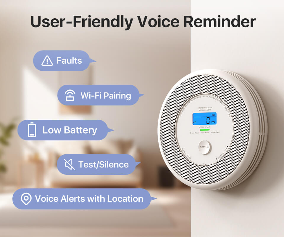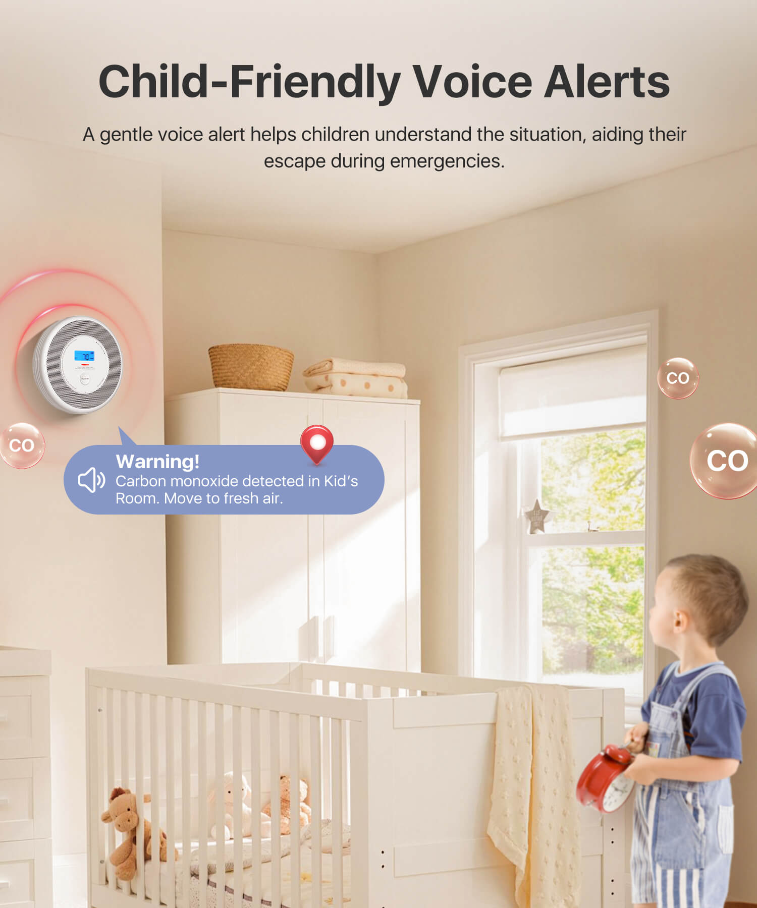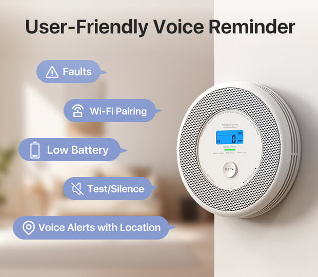 - Features a voice alert system that announces the type and location of detected threats, such as "Warning! Smoke detected in Living Room. Evacuate." This is particularly effective for ensuring all occupants understand and react quickly to the alert.